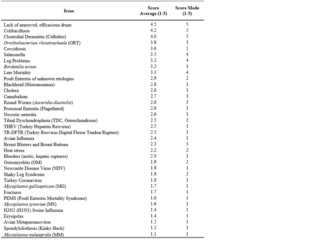 In preparation for this report to the USAHA Committee on Poultry & Other Avian Species, the subcommittee chairman, Dr. Clark, surveyed turkey industry professionals and veterinarians representing (n=26) the US turkey production regarding the health status of turkeys produced in August 2019 through