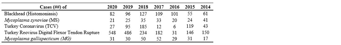 The turkey industry continues to work to reduce Salmonella (#6) colonization in birds. Poult enteritis of unknown etiologies has changed in importance, to position #10 (#12, 8, 10 and 14 from 2019 to 2016). Turkey Coronavirus (TCV), as a defined cause of enteritis, was ranked #29 (#29, 30, 30 and 31 from 2019 to 2016), with 27 reported cases, down from 95 (2019) and 185(2018) in previous years (Table 2).