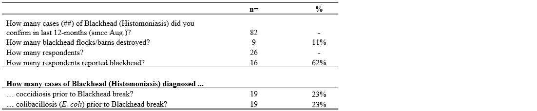 Blackhead (Clark and Kimminau, 2017; Regmi et al., 20160), also known as Histomonisis, increased to position #11 from #18 (#11, 8, 9 and 13 in 2018 to 2015, respectively). There were 82 reported cases of blackhead in 2020, down from 96 in 2019, and (Table 2) a decrease from the peak of 127 in 2018. Histomoniasis occurs regionally and seasonally in turkeys, and can result in significant mortality. Dimetridazole was extremely efficacious and previously approved for use in turkeys for the prevention and treatment of blackhead; it was banned in 1987. The lack of any legal treatment for histomoniasis is of concern, especially in the case of valuable turkey breeder candidate flocks. Losses to blackhead have been severe in several areas of Europe, and sporadic cases are occurring in North America. Nitarsone FDA approval was withdrawn December 31, 2015, leaving the industry with no drugs approved with indications against histomoniasis. Nitarsone was approved for the prevention of histomoniasis (blackhead disease) in turkeys and chickens, and was the only approved animal drug for this indication. Table 2a lists some additional blackhead responses, including a two-question survey as to inciting factors that might be associated with a blackhead break. Of those 16 respondents reporting 82 blackhead cases in 2020, 23% (n=19) reported a coccidiosis diagnosis and 23% (n=19) reported a colibacillosis (E. coli) diagnosis prior to the blackhead break. Sixteen respondents, equal to 62% of survey reported one or more cases of blackhead (54%, 63%, 2019; 74%, 2017). Of the 82 reported cases at least 11% (n=9) were destroyed to alleviate animal suffering and due to excess morbidity and mortality. Without efficacious approved pharmaceuticals, early diagnosis and start of interventions is considered part of controlling Histomonoas meleagridis in field conditions; for this reason, a sound monitoring system using diagnostic tools, such as PCR and serology is needed, in particular on problem farms.
