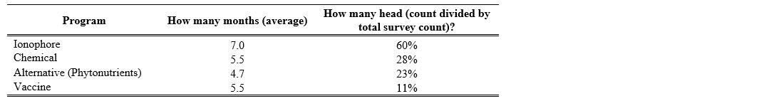 Coccidiosis increased to #5 from #8 ranking in 2019 (#4, #6, #13 in 2018 to 2016, respectively) most likely reflects the industry increasing raised without antibiotics (RWA) and no antibiotics ever (NAE) market. RWA and NAE programs do not permit the use of ionophore anticoccidials and some programs prohibit FDA approved chemical anticoccidials, so anticoccidial programs consist of alternative phytogenics or vaccination. An effective coccidiosis control program in turkeys involves the use of anticoccidial medications and/or phytonutrients and/or live vaccines and the subsequent development of immunity. Table 4 summarizes the US turkey production coccidia control products (n=260.0 million head, survey total) and ionophores