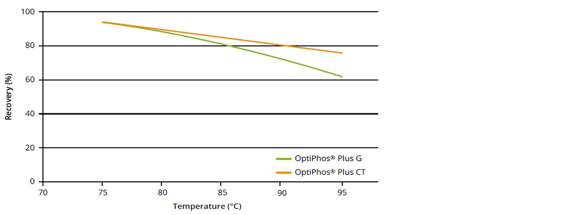 To avoid the breakdown of the added phytase during pelleting, the phytase must have high thermostability. An overview of the average recovery of the novel intrinsically heat-stable phytase OptiPhos® Plus, which was determined in over ten pelleting studies, is shown in Figure 1. It is evident that OptiPhos® Plus has intrinsic heat stability at 85oC (recovery > 80%) when applied in granular form (G). When a coated version (CT) is used, stability up to 95oC is observed.