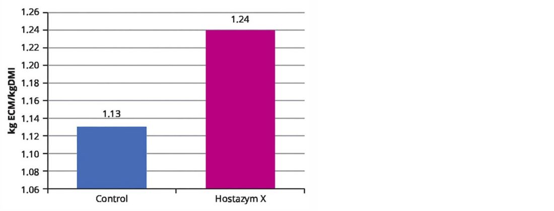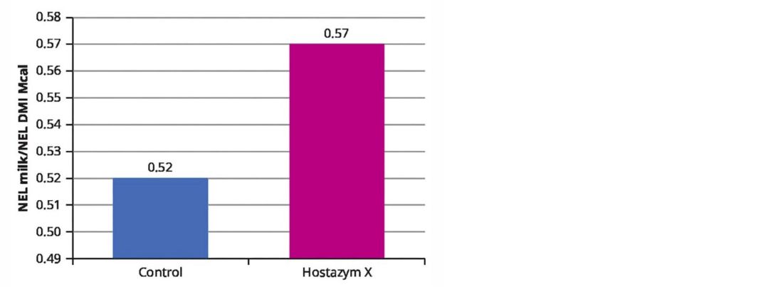 In a study carried out at the University of the Republic, Uruguay, both feed efficiency (Figure 1) and energy efficiency (Figure 2) were increased by 10%, and Hostazym X reduced the feed dry matter needed to produce 1 kg of ECM by 0.07 kg. Cows supplemented with Hostazym X utilised the feed more efficiently and produced more milk per kg of dry matter intake. The cows in the Hostazym X group also produced 1.8 kg more ECM and 0.1 kg more fat per day. As shown in the trial, Hostazym X is an efficient enzyme for use in dairy cow production with the potential to reduce input costs and increase herd profitability.
