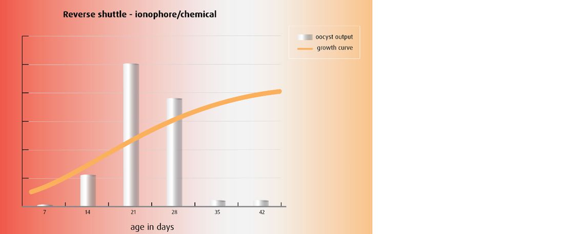 When looking at oocyst output, the number of oocysts in the house will be higher and will increase flock after flock when birds receive only an ionophore (Figure 1). A fully synthetic program will greatly reduce this output (Figure 2). In a reverse shuttle program, an ionophore is applied in the starter and grower phases, followed by a synthetic product in the finisher phase. This will result in another dynamic reduction in the oocyst output at the end of life (Figure 3).
