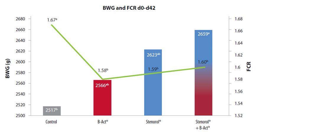 Since synthetics do not have an effect on Gram-positive bacteria such as Clostridium perfringens, it is advised to add an efficacious probiotic to a synthetic program. When comparing broiler performance in trial conditions using Stenorol® (Halofuginone) and B-Act® (Bacillius licheniformis) separately or combined, a clear trend of improved performance was seen when a synthetic and B-Act® were used together (Figure 7).