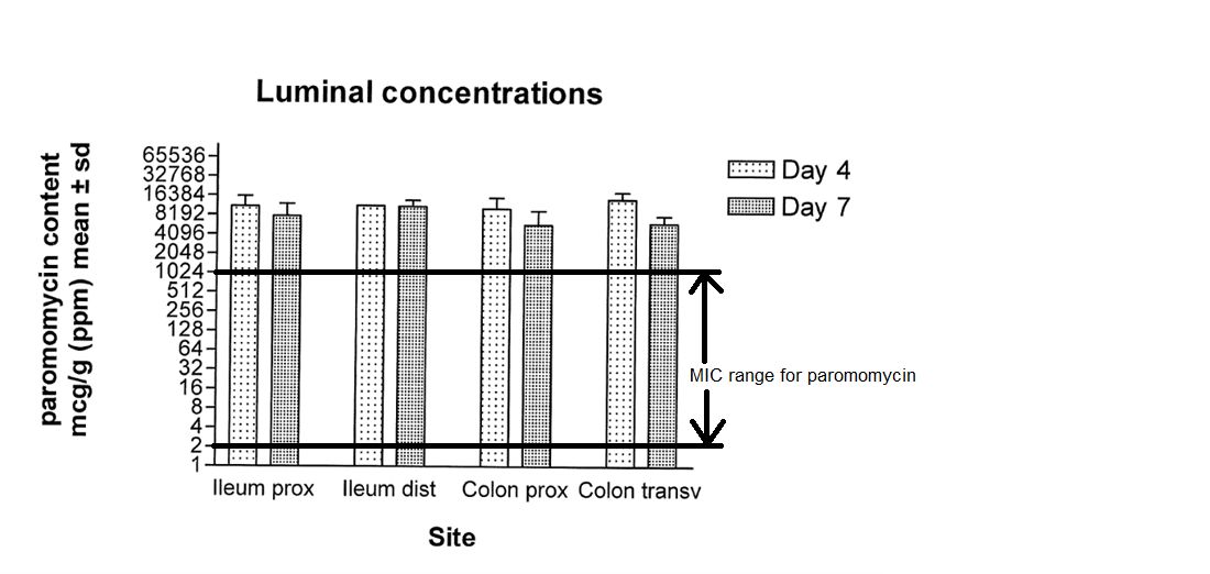 From a study conducted in 2015 (Figure 1), paromomycin concentrations in the lumen greatly exceeded the MIC 90 value of 1024 µg/g (Paromomycin MIC range: 2 > 1024, Vet Path IV project, strain collection 2015-2016) after oral administration at a dose of 50 mg/kg body weight (Fichant, 2015).