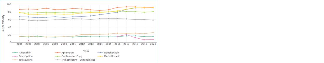 From a US study published in 2004 (Constable, 2004), only orally administered apramycin and marbofloxacin were found to be effective in field-observed diarrhoea. At the time of the trial, in France (Figure 2), 87% of E. coli were susceptible to apramycin and, in 2020, 91% were susceptible.