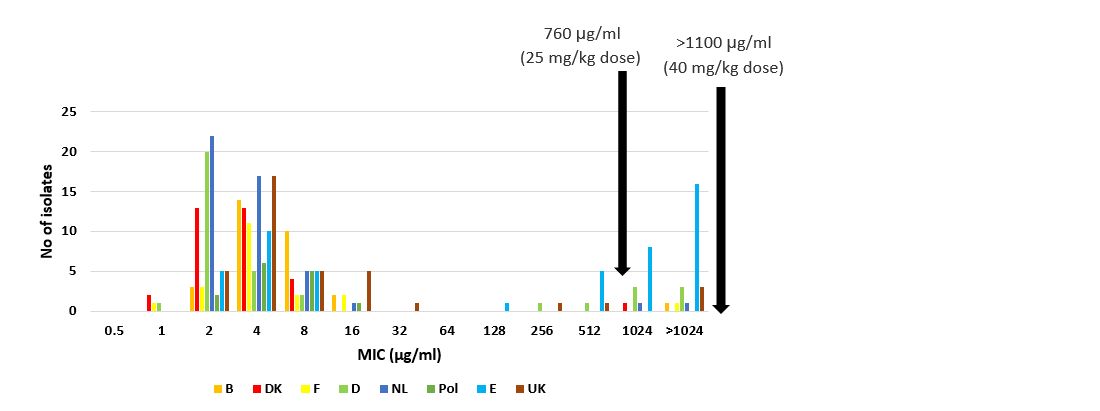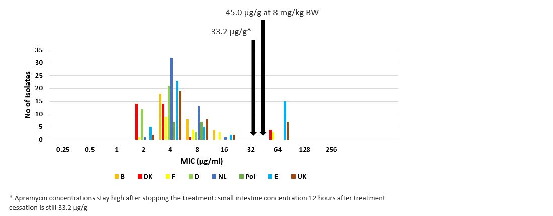 Antimicrobial susceptibility testing on E. coli strains is done in many countries. Apramycin minimum inhibitory concentration (MIC) test results from European E. coli strains are shown in relation to apramycin intestine concentrations achieved at treatment dosage after feed medication (Figure 3).