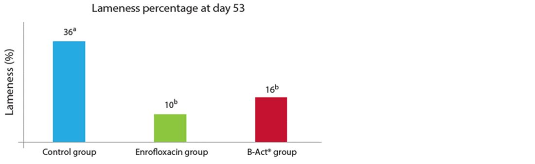 Both the antibiotic treatment and B-Act® mitigated the level of lameness significantly (p < 0.05). The onset of the first cases of lameness were 5 to 6 days later in the treatment groups compared to the control group.