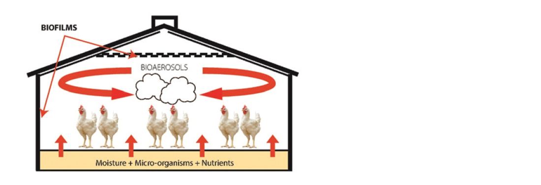 The presence of animals in the barn causes an increase in the temperature and humidity of the ambient air. This warm air rises to the top of the building, carrying with it many micro-organisms in the form of bioaerosols. Thus, all surfaces of the building become contaminated and biofilms are formed (Figure 1).