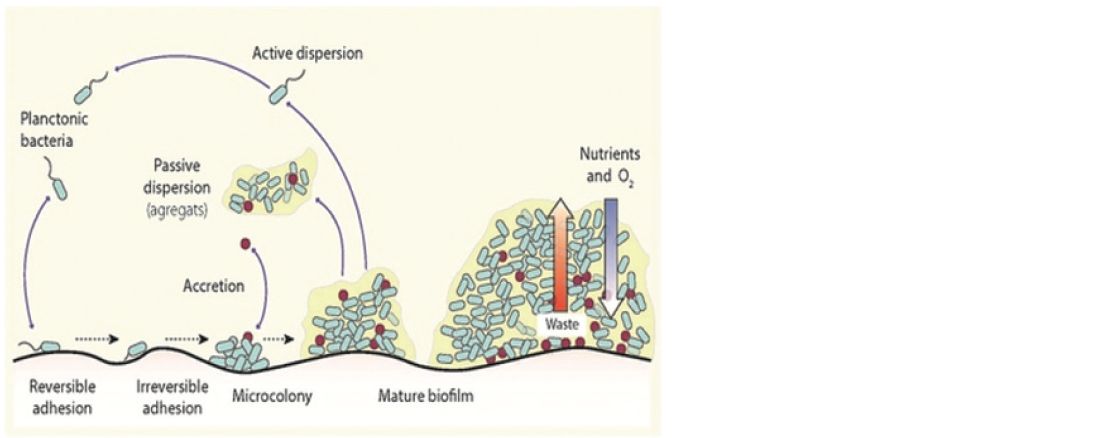 Biofilms are complex structures, constituting a considerable bacterial reserve. They are formed on surfaces through the accumulation of stacked bacteria which secrete a polysaccharide or extracellular polymeric substance (EPS) during the maturation phase. This mucous matrix is excreted through a network of channels in which the medium can circulate.