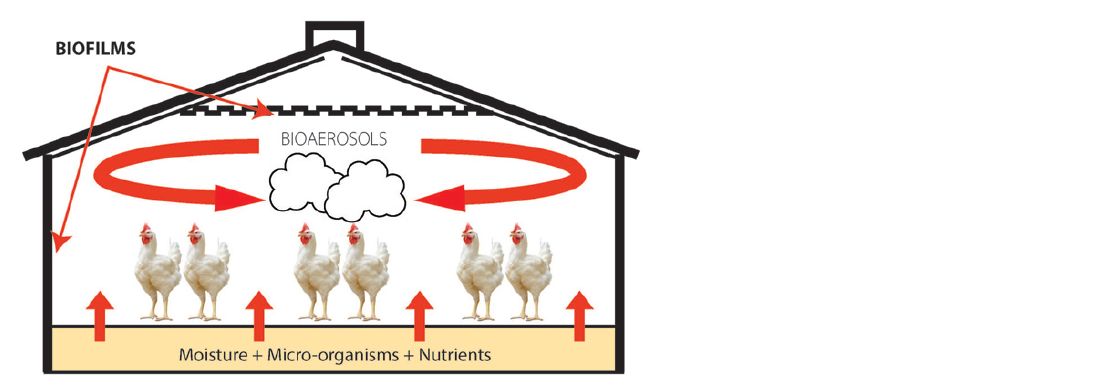 Dusts, or aerosols, form a significant vector for micro-organisms in livestock farming. They must be considered in a comprehensive approach to biosecurity in animal production. Thus, disinfection by air is a very effective technique to reduce infection pressure during the production period and completes the disinfection phase during the sanitary break.
