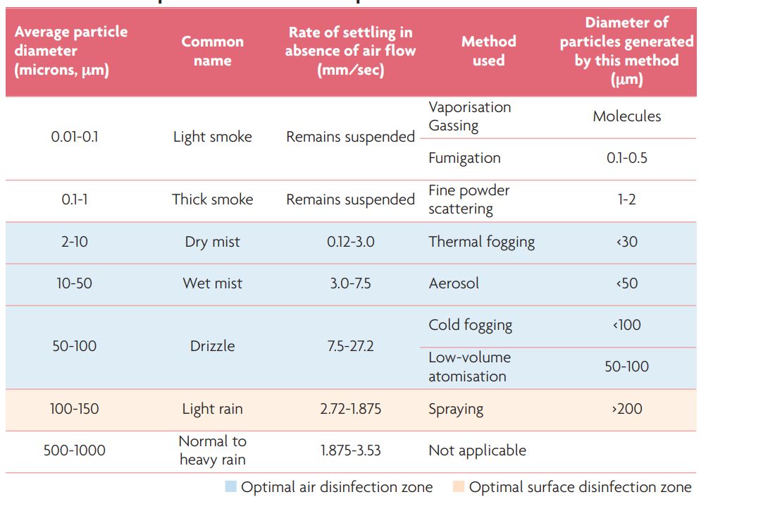 A specific volume can be subjected to disinfection by thermal fogging in an optimal manner using dry mist consisting of particles with a diameter of less than 30 microns. Nebulisation (cold fogging) gives rise to particles with a diameter of less than 100 microns (Table 2).