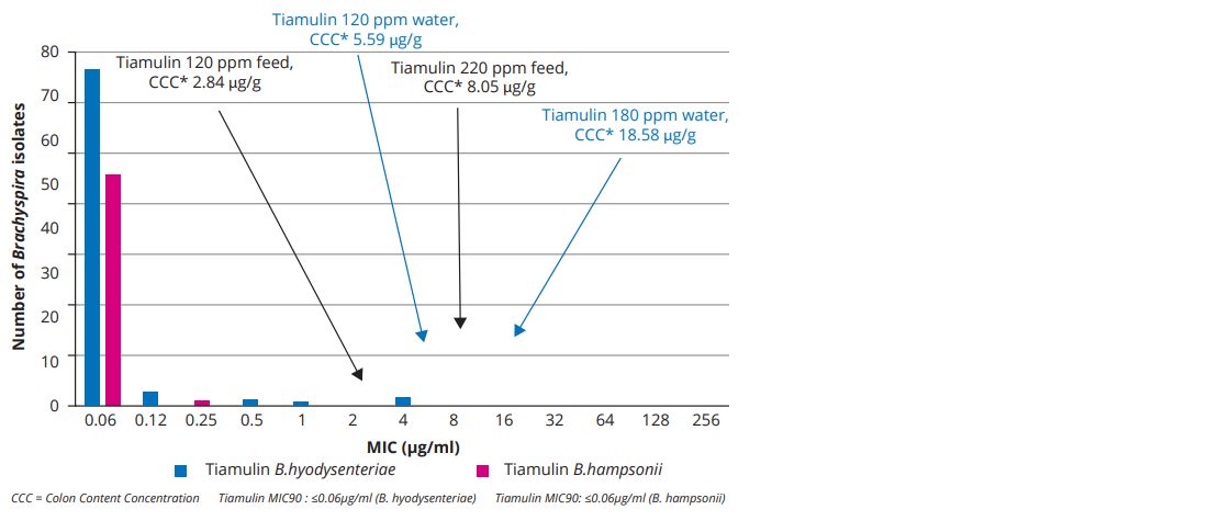 Effective tiamulin concentrations are achieved in the colon contents by feed and water medication at treatment dosages. The concentrations are far in excess of the determined MIC ranges and MIC90 values for B. hyodysenteriae and B. hampsonii isolates. They are sufficient to inhibit SD development and for effective SD treatment when given at registered dosage.