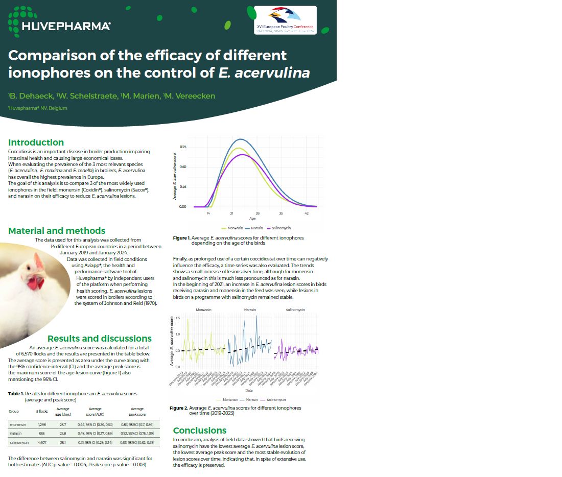 E. acervulina has the highest prevalence when evaluating the most relevant broiler species. Data collected in Aviapp indicate that Sacox® was the most effective in reducing E. acervulina lesions when comparing three of the most widely used ionophores. The analysis showed that birds receiving Sacox had the lowest scores, the lowest average peak score, and the most stable evolution of scores over time.