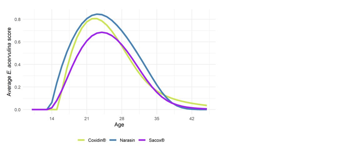 To conclude, Sacox is the best performing ionophore for controlling E. acervulina. It has the lowest average peak of E. acervulina scores when considering the age profile of the birds and over time it slowed the increase of E. acervulina lesions. The results over time also show the lowest variation compared with both other ionophores. For narasin, there was clearly an increase in E. acervulina lesions, suggesting that the control of E. acervulina is compromised when using narasin.
