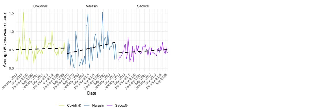 An age profile gives insightful information on a flock level basis. However, overuse of certain coccidiostats can lead to resistance and hence rotation should be kept in mind. To evaluate whether we see time trends in the three different ionophores, a time plot was made (Figure 2). The dotted black line indicates the linear direction of the average scores over the time. The increase of E. acervulina scores is much more pronounced for narasin compared to salinomycin (Sacox) and monensin (Coxidin). The increase is clearly seen in the narasin group as from the start of 2021, whereas Coxidin remains stable and Sacox even shows a slight reduction.