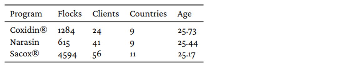 Most ionophores are used in a shuttle; narasin is the only ionophore which is not used in a full programme. The data from Aviapp was filtered on shuttle programmes which use a maximum of two different coccidiostats. Most of the shuttles were either Monimax® or a nicarbazin + narasin combination followed by an ionophore. Monensin (Coxidin®), salinomycin (Sacox®) and narasin are the three different ionophores which are used and compared in the current report. If the monitoring session was performed when on a shuttle program, the score was attributed to the ionophore only if it was scored while being on the ionophore. If the monitoring took place while the birds were still on the first coccidiostat (combination product), the score was not considered. The age of the birds was filtered to range between 0 and 45 days, with a minimum of 20 flocks per age and program to be able to precisely estimate the age profile.