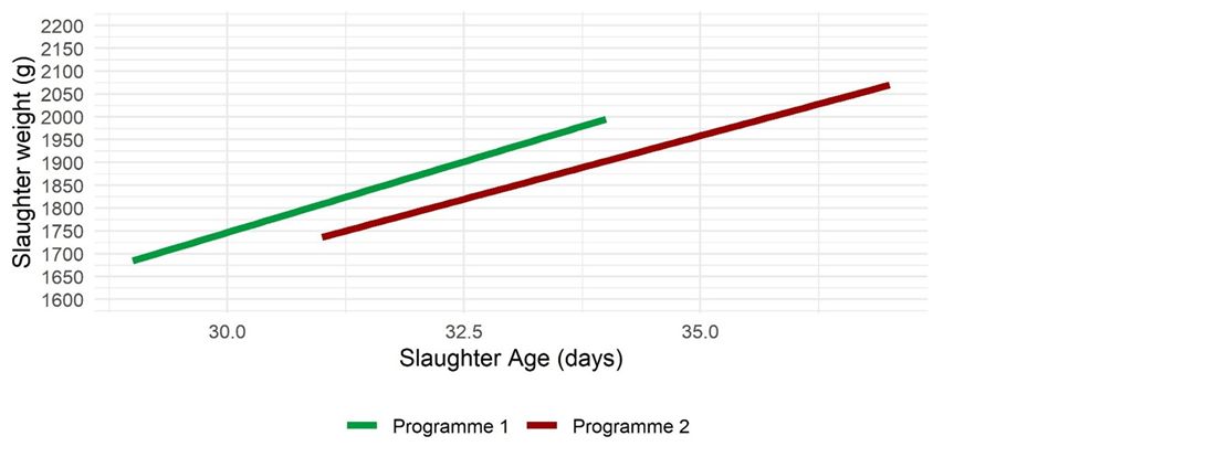 Flocks on programme 1 reached their target weight 1.8 days earlier (p < 0.001) compared to flocks on programme 2 (Figure 1).