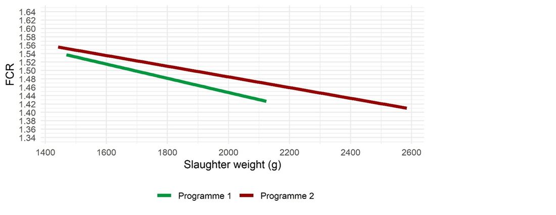 As broilers become older, the percentage of energy needed for maintenance becomes more important, hence the fact that FCR is expected to improve when target weights are reached earlier. The FCR results were adjusted to the average bodyweight of 1.850 kg and the difference between both programmes was 5 points (p < 0.001) in favour of programme 1 (Figure 2).