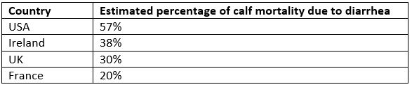 Calf diarrhea is one of the most commonly reported diseases on cattle farms and a major cause of economic loss to cattle producers worldwide. Table 1 shows the estimated percentage of all calf deaths caused by diarrhea in various countries.