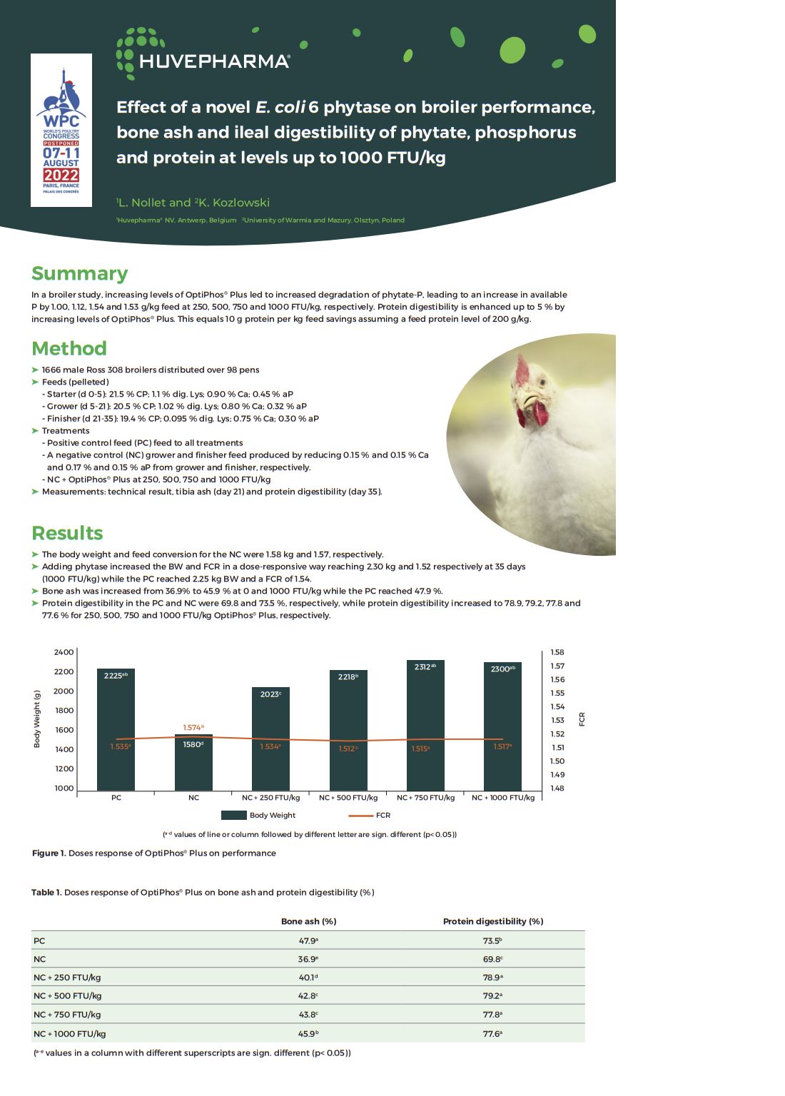 In a broiler study, increasing the level of OptiPhos® Plus in the diet resulted in increased degradation of phytate-phosphorus (P) which led to an increase in available P. This improved body weight and feed conversion rate in a dose response manner. Protein digestibility increased by five percentage points which is equal to a saving of 10 g protein per kg feed assuming a feed protein level of 200 g/kg.