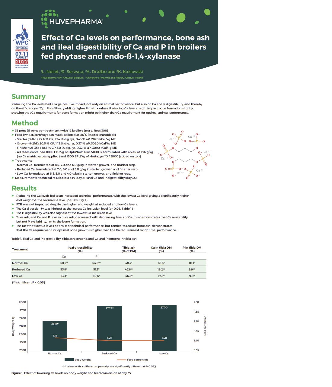 When Ca levels were reduced in broiler diets supplemented with phytase and endo-ß-1,4-xylanase, there was a large positive impact on performance and on Ca and P digestibility. This yielded a higher P matrix for OptiPhos Plus. However, caution must be taken when reducing dietary Ca levels as the requirements for bone formation might be higher than the requirements for optimal animal performance.