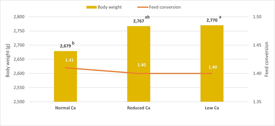 - Feed conversion was not impacted despite the higher end weights at reduced and low Ca levels