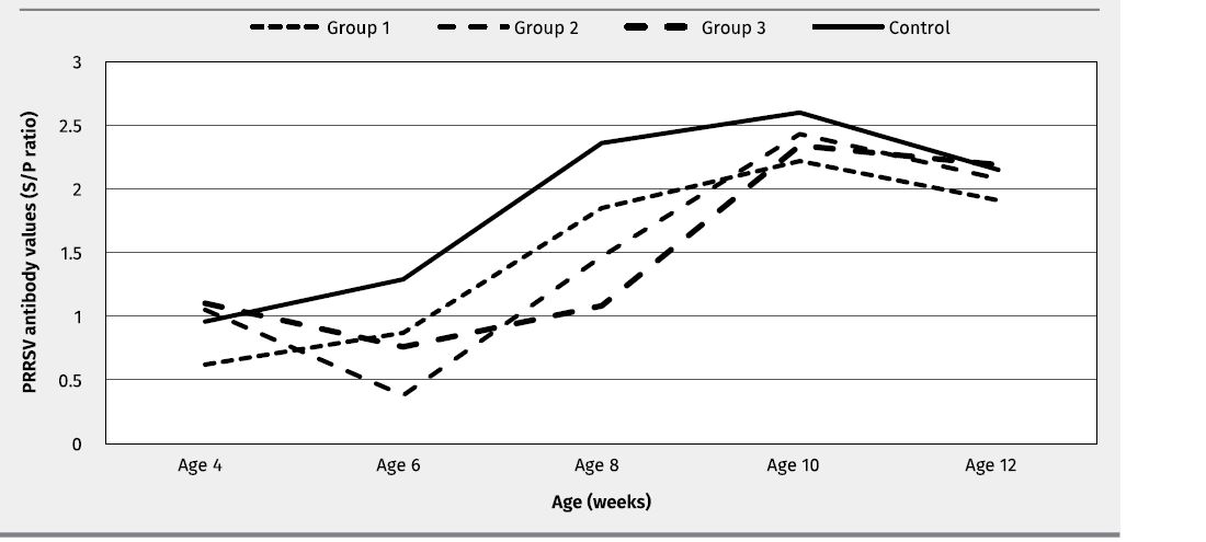 The study was conducted in a transition farm in Spain. The farm was selected based on PRRSV outbreaks two months before study onset and the presence of other respiratory pathogens (G parasuis, M hyopneumoniae). In total, 800 animals were divided into two groups at arrival.