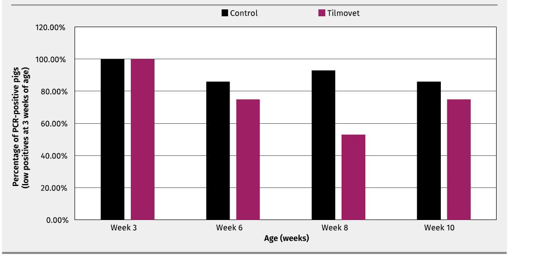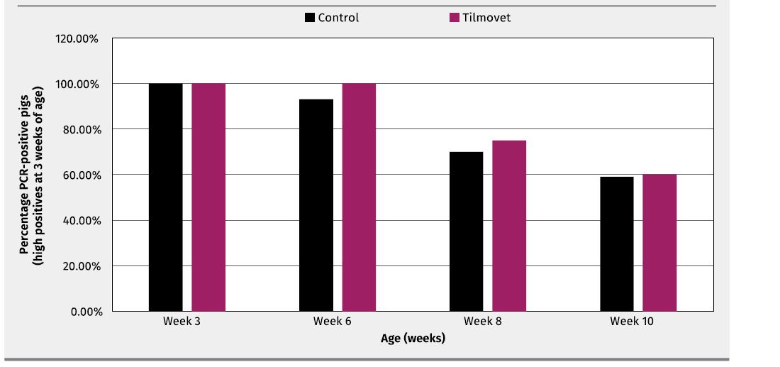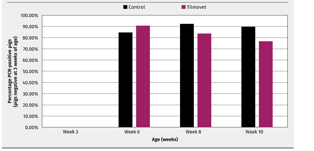 In high level PCR-positive pigs at the beginning of the study, a similar infection reduction by 25% at 8 weeks of age and 40% at 10 weeks of age in the Tilmovet group vs. the control group with 29% (week 8) and 40% (week 10) was found (Figure 4).