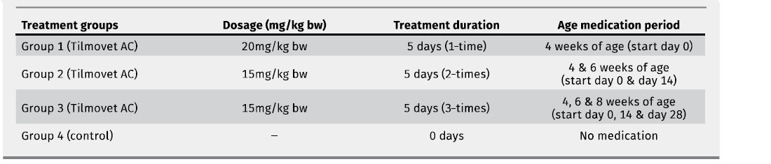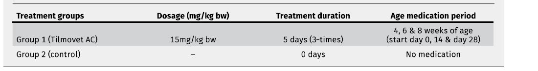 Group 1 - Tilmovet AC treatment at three time periods of five consecutive days (dose 15 mg/kg body weight). Between the three medication time periods, non-treatment periods of 14 days were established (Table 2).