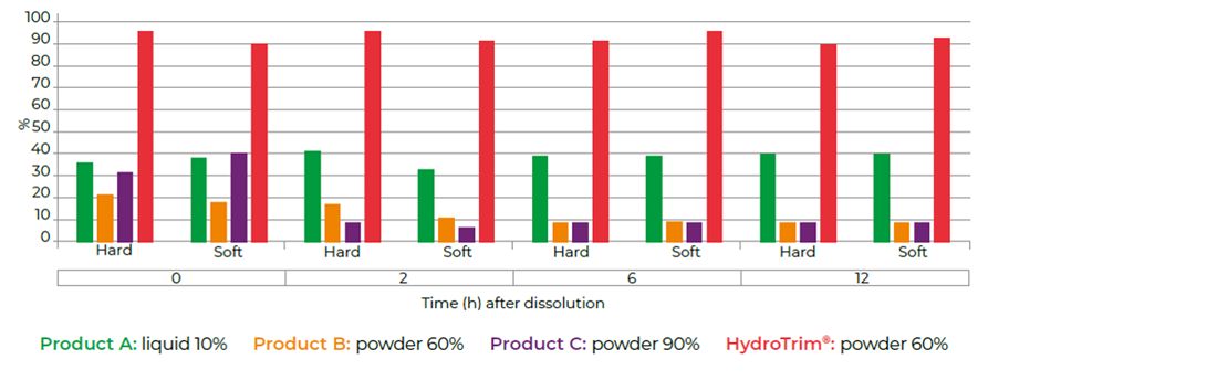 - HydroTrim remained homogenous at all time points in both hard and soft water.