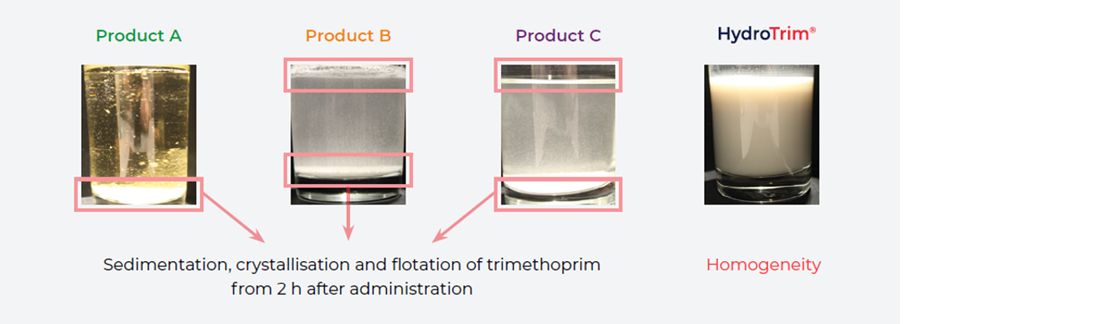 Trimethoprim is a poorly water-soluble antimicrobial with a maximum solubility of 0.4 mg/ml. The subsequent sedimentation of trimethoprim after product administration in highly concentrated stock solutions (proportioners) jeopardises the efficacy of water-soluble products containing sulfonamides and trimethoprim. If only the sulfonamide part is dissolved, animals don't benefit from the synergism, resulting in a lack of clinical efficacy. Furthermore, sedimentation in the water delivery systems creates extra work for the farmer and increases the risk of blockages in the pipelines.