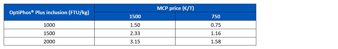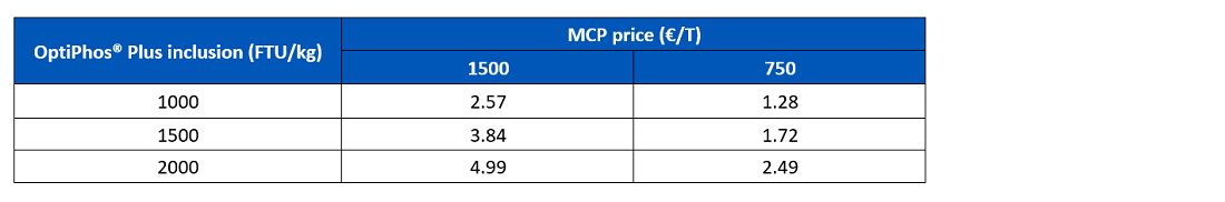 Recently, MCP prices have dropped from around €1500/T to approximately €750/T om the EU. An obvious question results: is it still profitable to dose OptiPhos Plus at levels up to 2000 FTU/kg?