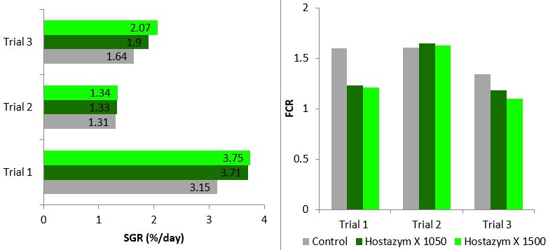 To demonstrate the efficacy of Hostazym® X in increasing performance and improving nutrient utilization in carp, three research trials were set. The trials compared a control diet with a control diet supplemented with Hostazym® X (at 1050 or 1500 EPU/kg), using commercial standard feeds which meet the nutritional requirements of the species and growth stage (diets formulated with fish meal, blood meal, soybean and rapeseed meal as the main protein sources). Trials were conducted with common carp species, during a 90-day growth period using fish at different growth stages. In two of the trials, nutrient digestibility / deposition was also measured.