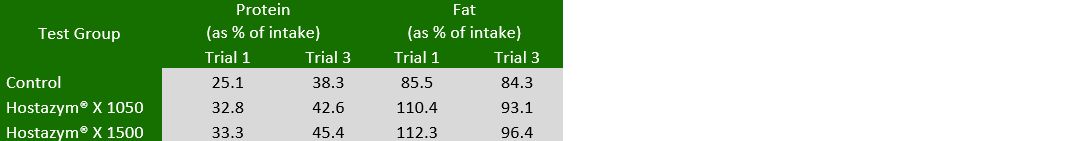 - Compared to the control group, all diets supplemented with Hostazym® X had significantly better nutrient deposition for protein and fat.