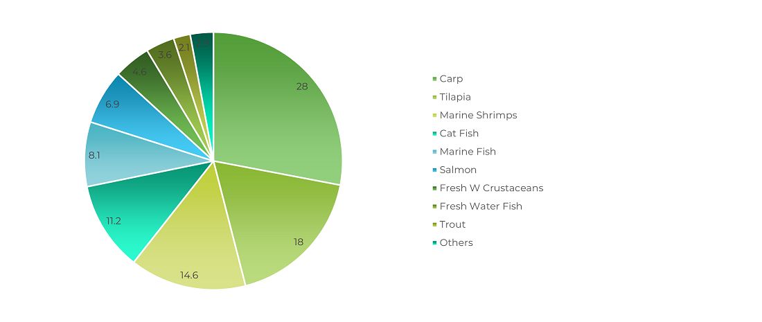 Alongside aquaculture growth, the aquafeed markets have followed the same fast-growing trend. Recently, aquaculture feed production grew by 3.7% and is estimated to be around 57 million tonnes. Production is dominated by carps, with approximately 28%, followed by tilapia at 18%, marine shrimp at 14.6%, catfish at 11.2%, marine fish at 8.1%, salmon at 6.9%, freshwater crustaceans at 4.6%, other freshwater fish at 3.6%, trout at 2.1%, and other species accounting for 2.9% (Figure 1).