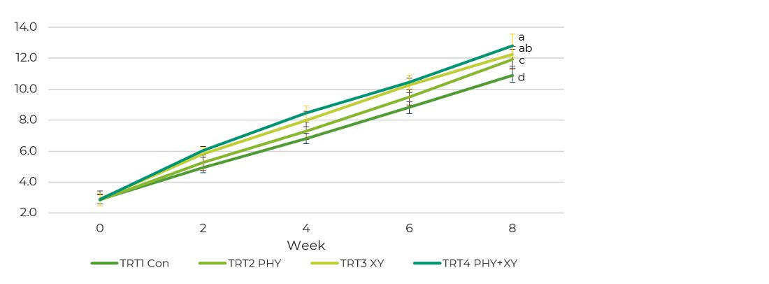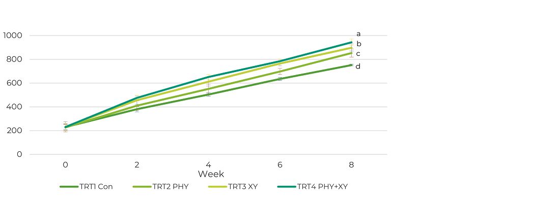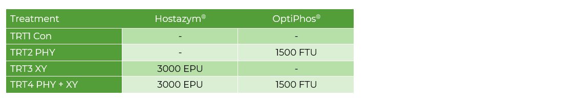 - Hostazym X at 3000 EPU/kg feed + OptiPhos at 1500 FTU/kg feed (PHY + XY)
