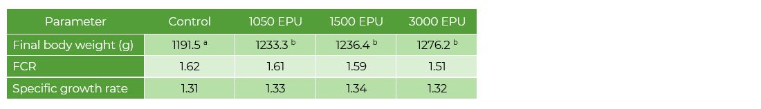 - Feed conversion rate (FCR) decreased numerically compared to the control group