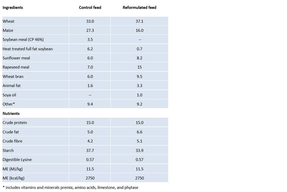- Reformulated diet - control feed reformulated to the same nutritional specifications but replacing soybean with sunflower meal, rapeseed meal and wheat bran