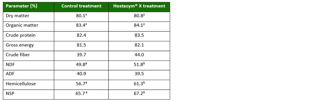 - Supplementation with Hostazym® X led to a significant increase in total apparent faecal digestibility of NDF (neutral detergent fibre), hemicellulose and NSP (non-starch polysaccharides; p <0.05).