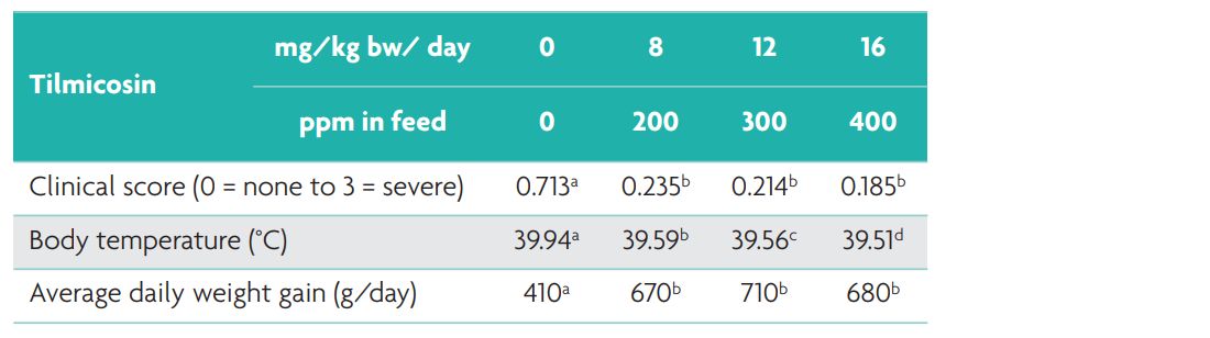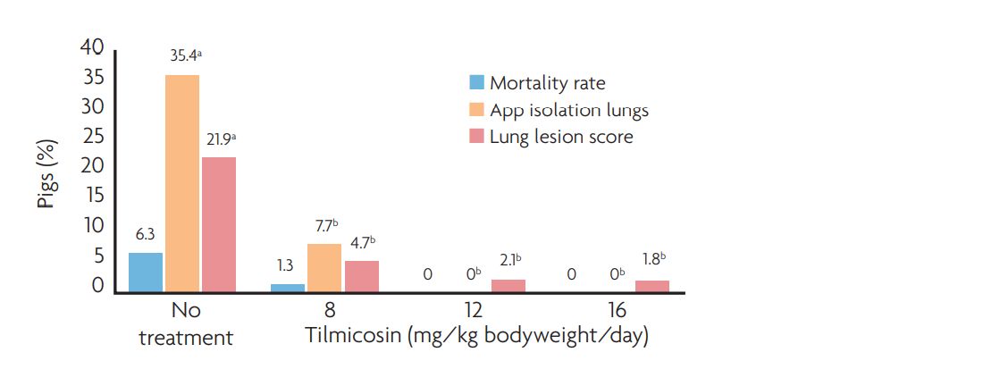 Therefore, tilmicosin is the first choice product for the treatment of Porcine Respiratory Disease Complex. The excellent efficacy of medication with tilmicosin (Tilmovet) after introduction of App intra-nasally to infect pigs was examined at different dose levels in feed in a herd free from M. hyopneumoniae.