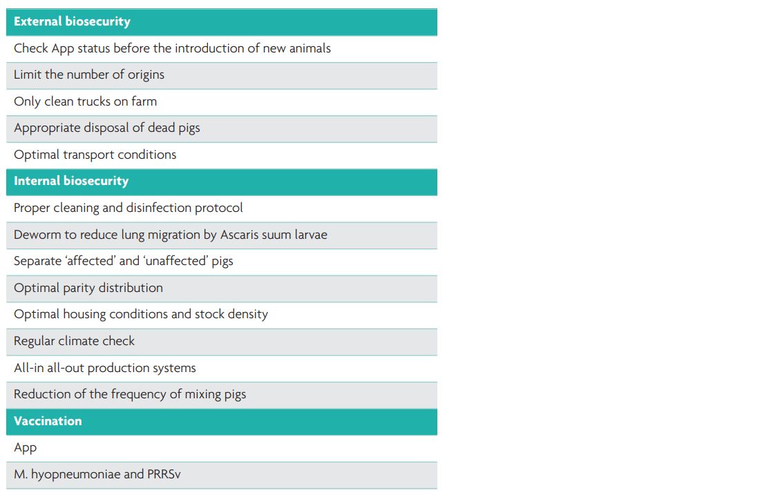 The incidence and impact of App infections in the field can be reduced by several preventative measures (Table 1). Special attention should also be paid to external (avoiding the introduction of the pathogen) and internal biosecurity (reducing the risk of further spreading within the farm).