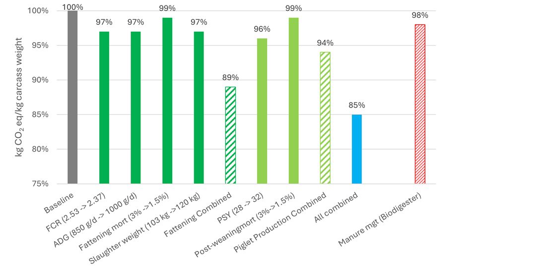 A baseline farm was identified based on average figures (Table 1). In the various scenarios, the feed ration was kept the same, but the technical parameters were modified. In each scenario, one technical parameter was improved from the baseline situation and the carbon footprints were compared. In Figure 1, the carbon footprint of each scenario is weighted relative to the baseline situation. The different scenarios have been grouped according to the fattening phase (dark green), piglet production (light green) plus columns where they are all combined (stripped). As manure management is also important, a scenario was added where the manure was stored and further processed in a biodigester (red).