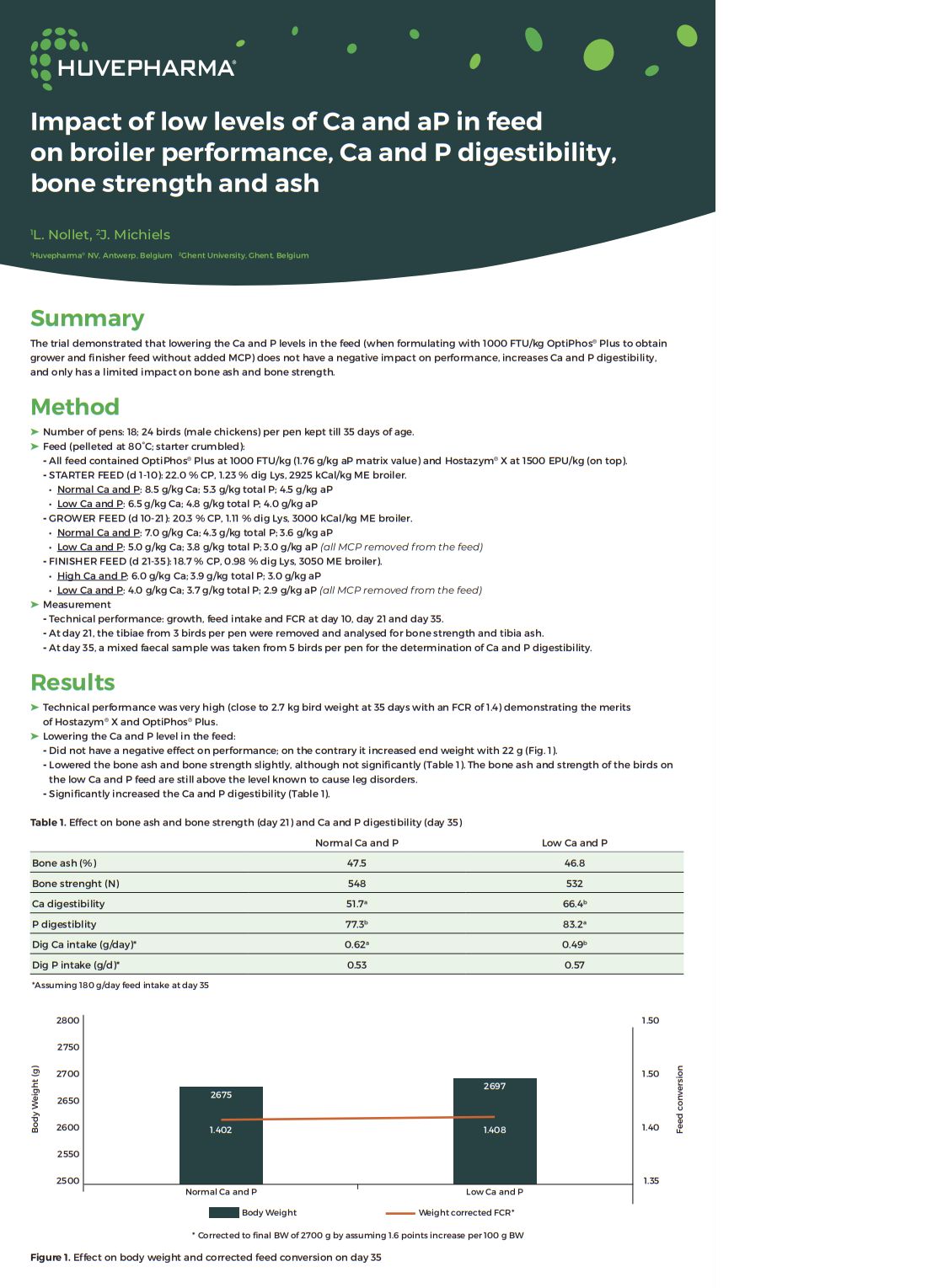 Lowering the calcium (Ca) and phosphorus (P) levels in the feed when formulating with 1000 FTU/kg OptiPhos® Plus to obtain grower and finisher feed without added monocalcium phosphate (MCP) has a positive impact on performance. Lowering the Ca levels improves P digestibility and is therefore a useful tool for optimising the efficiency of the phytase and reducing the level of inorganic P in the feed.