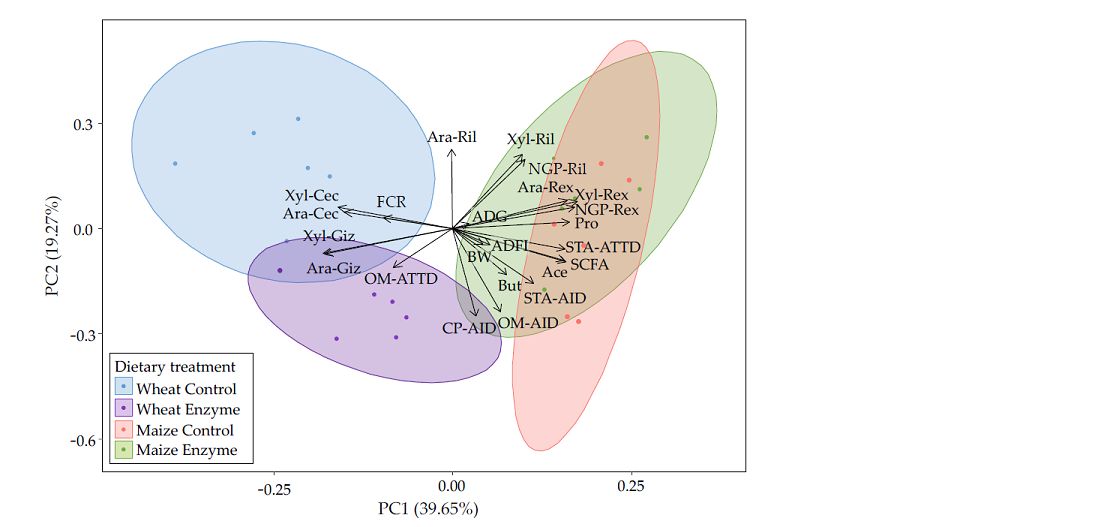 The first principal component (PC1) explained 39.65%, and the second principal component (PC2) explained 19.27% of the total variance. Overall, PC1 appeared to separate the wheat-based from the maize-based DT while WC and WE were further separated by PC2. WC presented high Ara and Xyl contents in the cecum (Ara-Cec, Xyl-Cec) and high FCR values. WE formed a separate cluster from WC mainly due to the higher Xyl-Giz, Ara-Giz, OM-AID, OM-ATTD, and CP-AID loadings. The maize-based DT were clustered together and presented differences compared to both WC and WE. Both MC and ME were characterized by high Ara, Xyl, and NGP recovery in the ileum (Ril) and excreta (Rex).