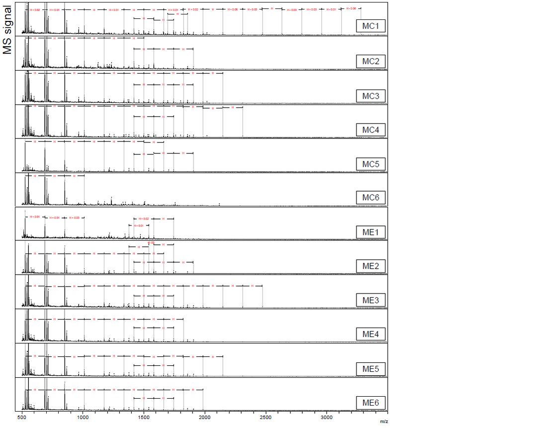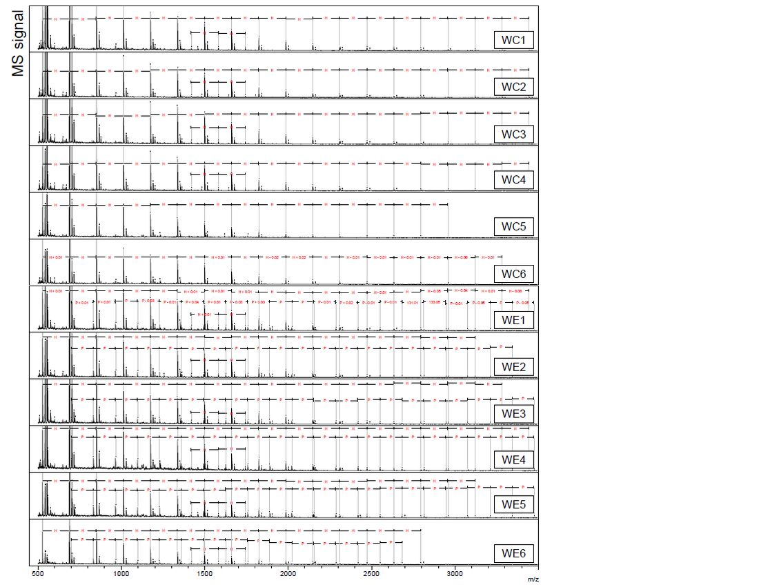 At first glance, m/z values corresponding to homologous series of hexose oligomers were abundantly detected in all samples (sequential increments of m/z 162). The hexose oligomers in both wheat-based DT had a polymerization degree (DP) of 3 to 21 (Figure 1a,b). Hexose oligomers of DP 3 to 10 were detected in both maize-based DT (Figure 1c,d). Another series of three oligomers with two consecutive m/z 162 increments (m/z 1419), 1581, and 1743) was present in all four DT. Alongside these compounds, a homologous series with increments of m/z 132 was detected in WE, representing pentose oligomers (Figure 1b). The pentose oligomers were detected in all six replicate pens (Figure A1 and A2) between m/z 701 and m/z 3444 and presented DP 5-26. The pentose oligomers were unique for the WE treatment and were absent in WC, MC and ME.