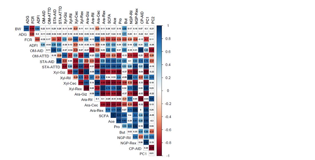 The data obtained for NSP content and recovery along the GIT, SCFA content in the ceca, nutrient digestibility, and animal growth were subjected to principal component analysis (PCA) using R. Next, the Pearson correlation coefficients of the aforementioned variables were calculated, and the corresponding correlation matrix was constructed to visualize the relations. Correlations with p < 0.05 were considered significant.