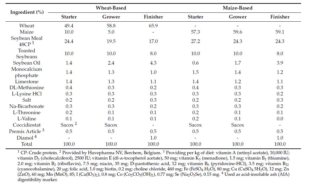 All experimental basal diets were manufactured by Research Diet Services B.V. (Wijk bij Duurstede, The Netherlands), as summarized in Table 1. Acid-insoluble ash (Diamol; Franz Bertram GmbH, Germany) was added as a digestibility marker to the finisher diets.