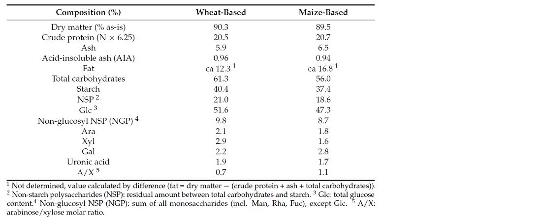 The potential oligosaccharide release by glucanase could not be confirmed in this study. This could be partly attribued to the low amount of B-glucan present in both wheat and maize (Bach Knudsen, 2014). Additionally, the high abundance of maltodextrins and FOS observed in the ileum could have potentially masked the presence of cello-oligosaccharides with the same mass. Hydrolysis of cell wall NSP, such as AX and cellulose, by xylanase and/or glucanase, is believed to have occurred in both wheat and maize but not necessarily resulting in oligosaccharide release. Therefore, partial cell wall degradation by NSPases may play an important role in reducing nutrient encapsulation by insoluble NSP (Dornez et al., 2009; Meng and Slominski, 2005).