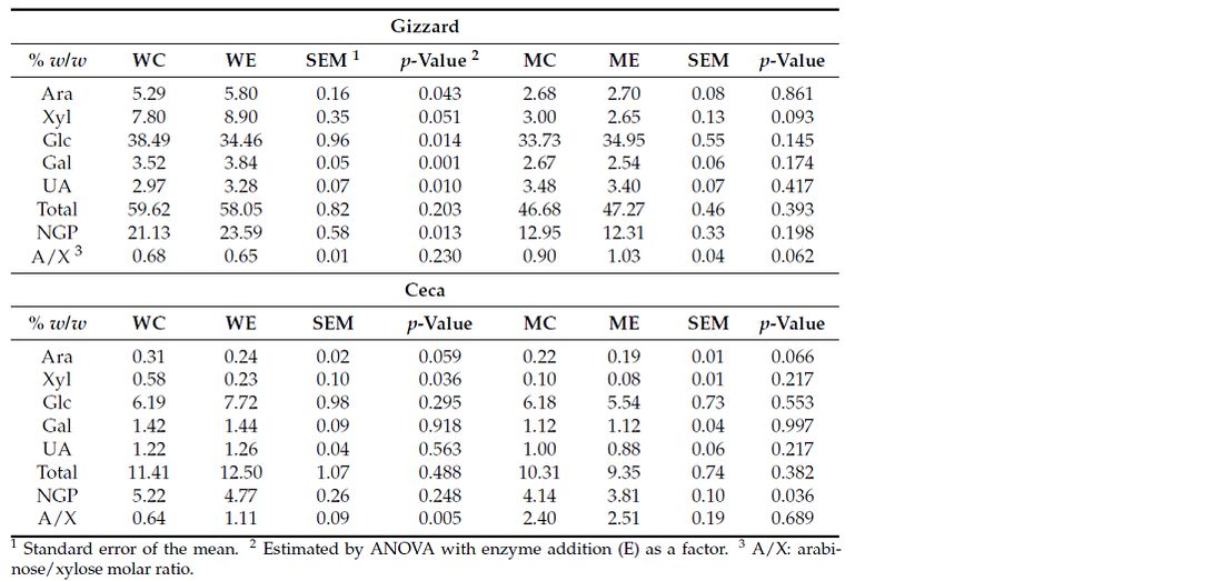In order to evaluate the effect of enzyme addition on the carbohydrate content present in digesta, the monosaccharide content after acid hydrolysis of all carbohydrates present in the finisher diets, gizzard, ileum, ceca, and excreta was determined (Tables 2, 3 and A2).